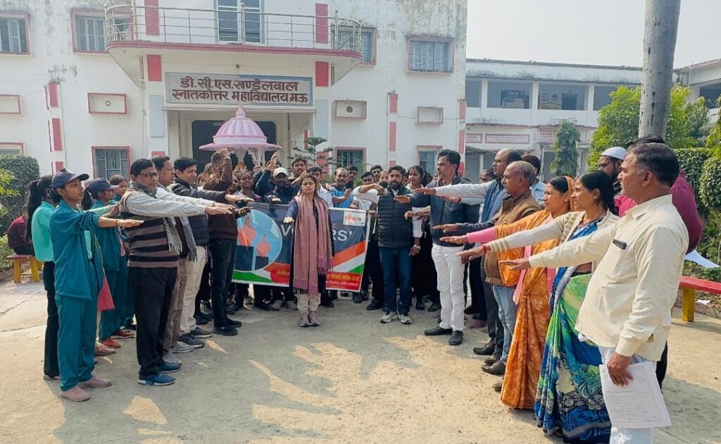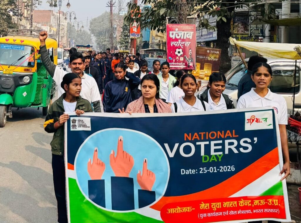 दैनिक इंडिया न्यूज़, मऊ।राष्ट्रीय मतदाता दिवस के अवसर पर मेरा युवा भारत केंद्र, मऊ एवं राष्ट्रीय सेवा योजना (एनएसएस) के संयुक्त तत्वावधान में मतदाता जागरूकता पदयात्रा का आयोजन किया गया। यह पदयात्रा डीसी एसके पीजी कॉलेज, मऊ से प्रारंभ होकर गाजीपुर तिराहा तक निकाली गई, जिसका मुख्य उद्देश्य युवाओं एवं आम नागरिकों को मतदान के महत्व के प्रति जागरूक करना तथा लोकतांत्रिक मूल्यों को सुदृढ़ करना रहा।